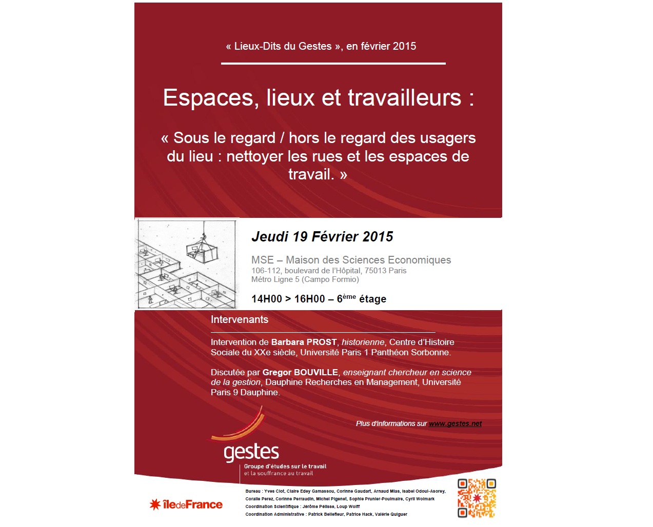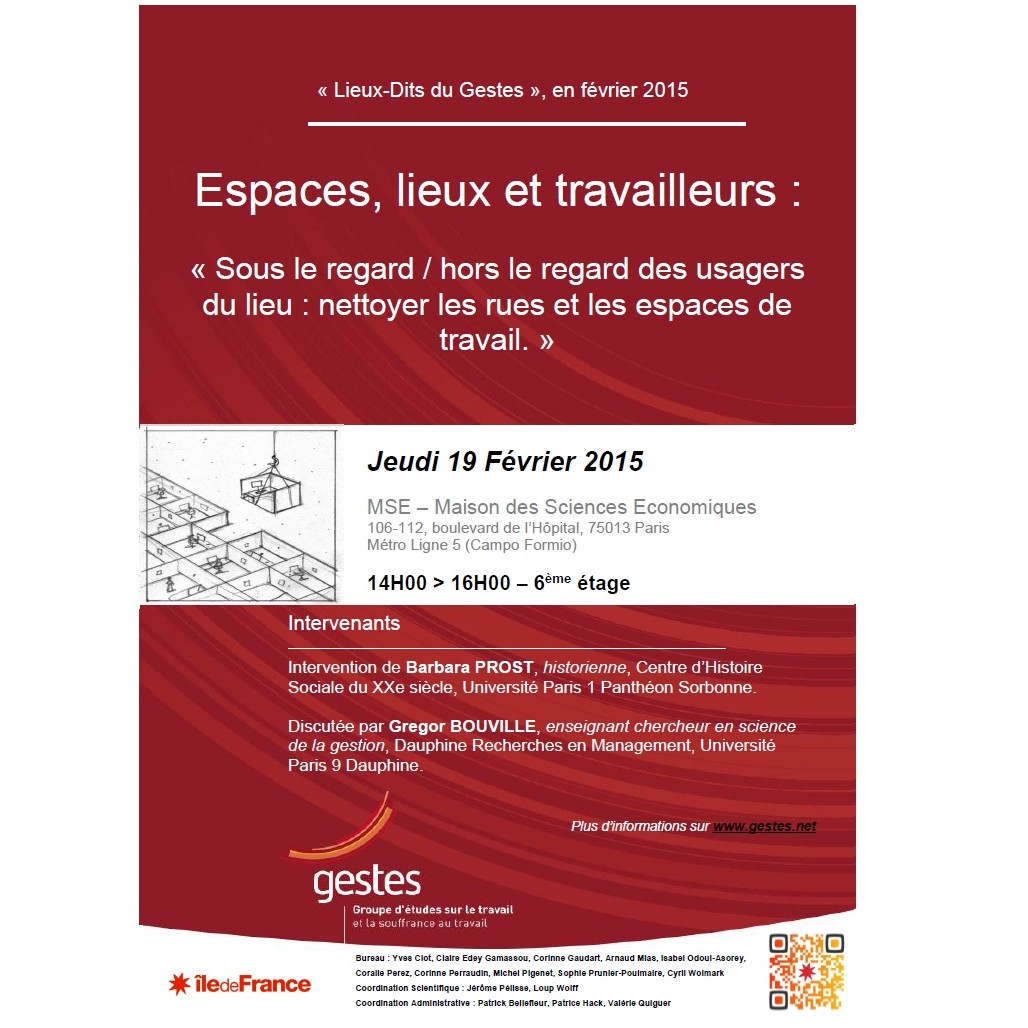 Le Gestes propose un séminaire le jeudi 19 février 2015 intitulé « Sous le regard / hors le regard des usagers du lieu : nettoyer les rues et les espaces de travail. », de 14h à 16h